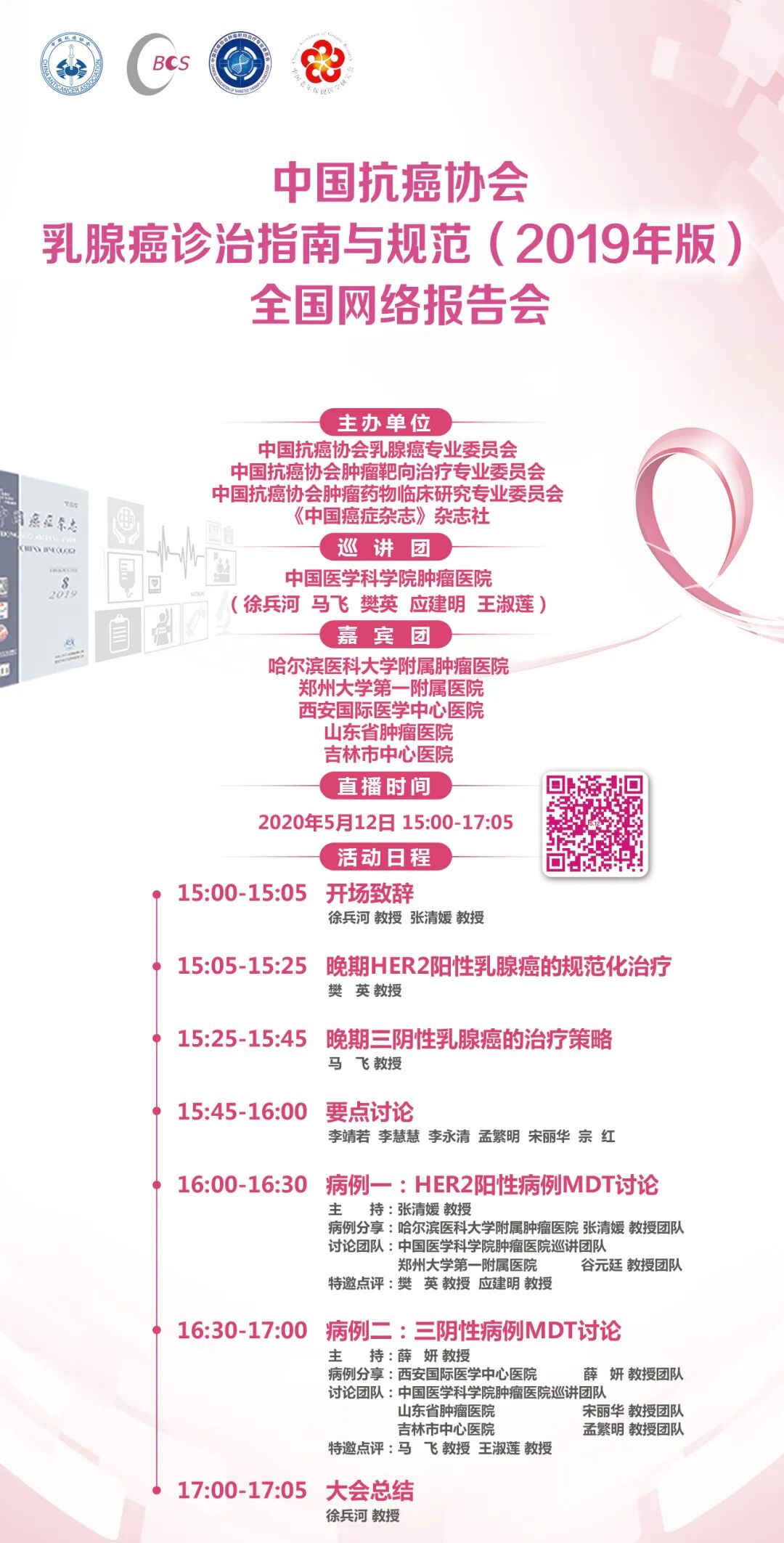 为帮助医生及患者更好地理解指南更新要点,由中国抗癌协会主办的“中国抗癌协会 乳腺癌诊治指南和规范(2019年版)全国网络报告会”系列活动,将于2020年5月12日15:00-17:05线上直播,扫描海报二维码进入直播间,欢迎各位同道积极参加。